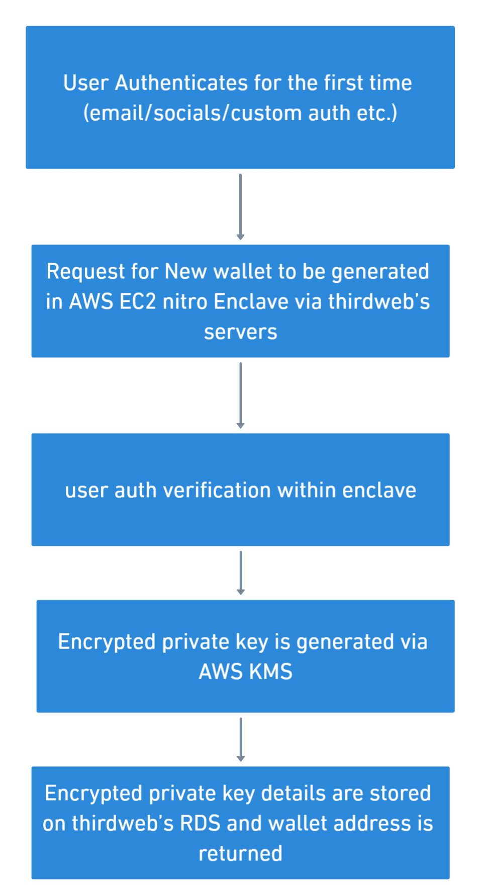 When a user signs into an application using their email or social logins for the first time, a wallet is generated within a secure enclave on the server after verifying the user's legitimacy. The enclave provides a trusted execution environment, ensuring the wallet creation process is isolated and protected from external interference.